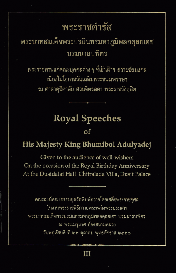 พระราชดำรัสพระบาทสมเด็จพระปรมินทรมหาภูมิพลอดุลยเดช บรมนาถบพิตร พระราชทานแก่คณะบุคคลต่าง ๆ ที่เข้าเฝ้าฯ ถวายชัยมงคลเนื่องในโอกาสวันเฉลิมพระชนมพรรษา ณ ศาลาดุสิดาลัย สวนจิตลดา พระราชวังดุสิต เล่ม 3 = Royal speeches of His Majesty King Bhumibol Adulyadej given to the audience of well-wishers on the occasion of the royal birthday anniversary at the Dusidalai Hall, Chitralada Villa, Dusit Palace.