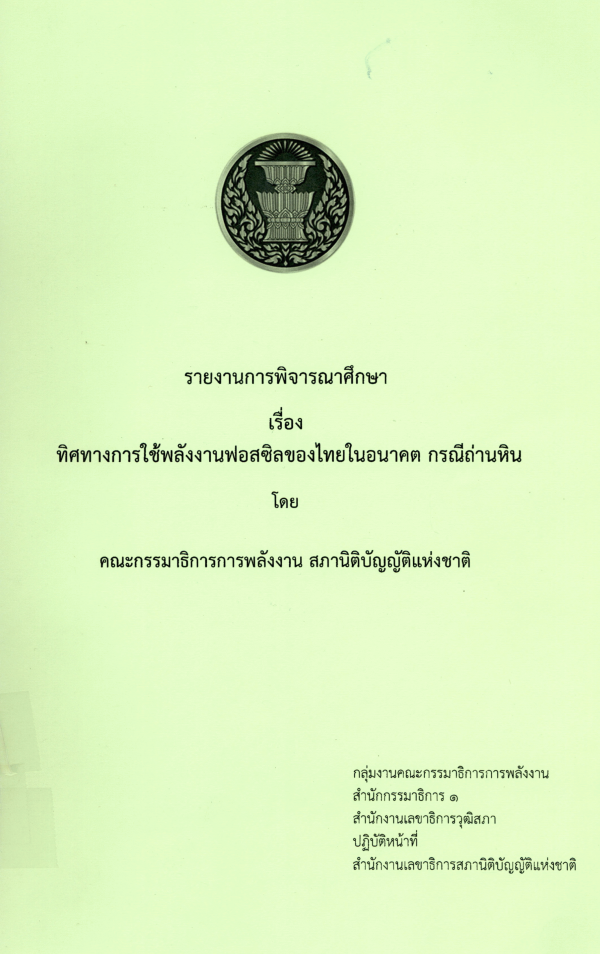 รายงานการพิจารณาศึกษา เรื่อง ทิศทางการใช้พลังงานฟอสซิลของไทยในอนาคต กรณีถ่านหิน โดย คณะกรรมาธิการการพลังงาน สภานิติบัญญัติแห่งชาติ / สำนักกรรมาธิการ 1 สำนักงานเลขาธิการวุฒิสภา ปฏิบัติหน้าที่สำนักงานเลขาธิการสภานิติบัญญัติแห่งชาติ.