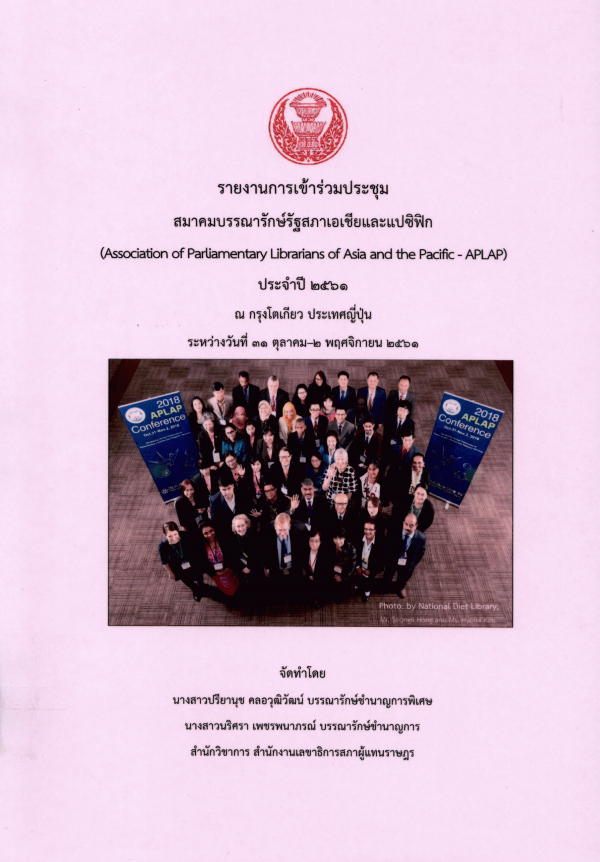 รายงานการเข้าร่วมประชุมสมาคมบรรณารักษ์รัฐสภาเอเซียและแปซิฟิก (Association of Parliamentary Librarians of Asia and the Pacific : APLAP) ประจำปี 2561 ณ กรุงโตเกียว ประเทศญี่ปุ่น ระหว่างวันที่ 31 ตุลาคม-2 พฤศจิกายน 2561 / สำนักวิชาการ สำนักงานเลขาธิการสภาผู้แทนราษฎร.