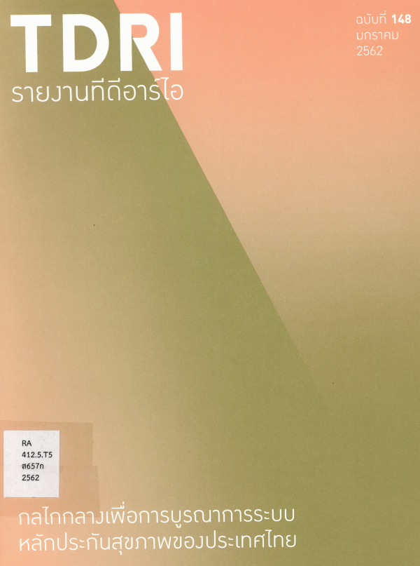 กลไกกลางเพื่อการบูรณาการระบบหลักประกันสุขภาพของประเทศไทย (รายงานทีดีอาร์ไอ ฉบับที่ 148 มกราคม 2562) / สรุป, สายใจ วิทยาอนุมาส ; บรรณาธิการบริหาร, จิรากร ยิ่งไพบูลย์วงศ์ ; กองบรรณาธิการ, วัฒนา กาญจนานิจ.