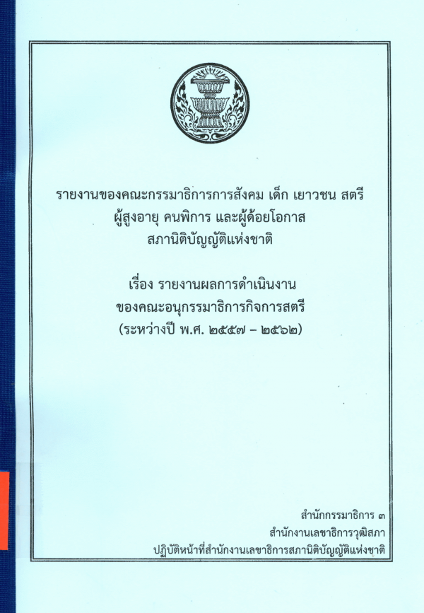 สำนักงานเลขาธิการวุฒิสภา ปฏิบัติหน้าที่สำนักงานเลขาธิการสภานิติบัญญัติแห่งชาติ, คณะกรรมาธิการการสังคม เด็ก เยาวชน สตรี ผู้สูงอายุ คนพิการ และผู้ด้อยโอกาส สภานิติบัญญัติแห่งชาติ, . 2562. รายงานของคณะกรรมาธิการการสังคม เด็ก เยาวชน สตรี ผู้สูงอายุ คนพิการ และผู้ด้อยโอกาส สภานิติบัญญัติแห่งชาติ เรื่อง รายงานผลการดำเนินงานของคณะอนุกรรมาธิการกิจการสตรี (ระหว่างปี พ.ศ. 2557 - 2562). กรุงเทพฯ: สำนักกรรมาธิการ 3 สำนักงานเลขาธิการวุฒิสภา ปฏิบัติหน้าที่สำนักงานเลขาธิการสภานิติบัญญัติแห่งชาติ.