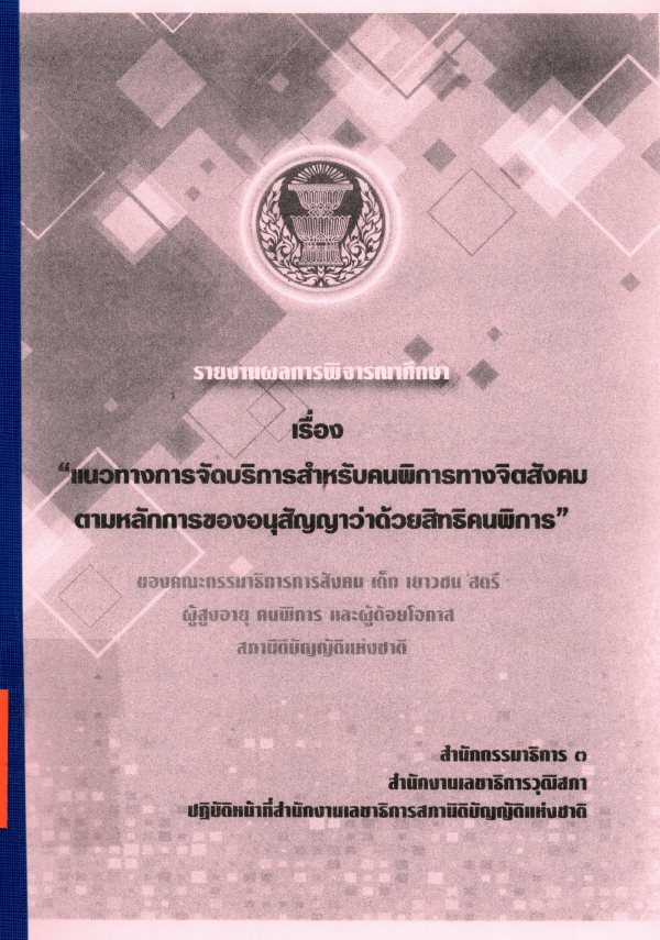 รายงานผลการพิจารณาศึกษา เรื่่อง แนวทางการจัดบริการสำหรับคนพิการทางจิตสังคม ตามหลักการของอนุสัญญาว่าด้วยสิทธิคนพิการ ของ คณะกรรมาธิการการสังคม เด็ก เยาวชน สตรี ผู้สูงอายุ คนพิการ และผู้ด้อยโอกาส สภานิติบัญญัติแห่งชาติ/ สำนักกรรมาธิการ 3 สำนักงานเลขาธิการวุฒิสภา ปฏิบัติหน้าที่สำนักงานเลขาธิการสภานิติบัญญัติแห่งชาติ.