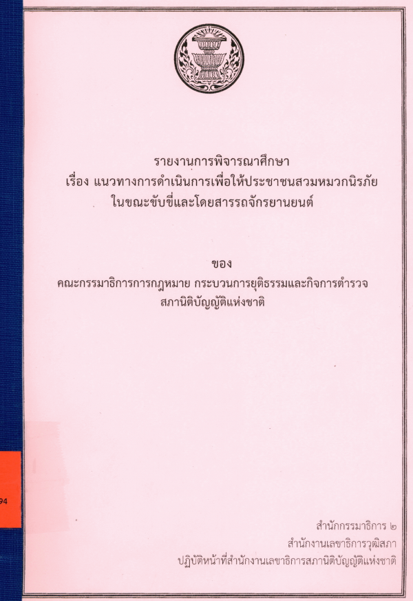 รายงานการพิจารณาศึกษา เรื่อง แนวทางการดำเนินการเพื่อให้ประชาชนสวมหมวกนิรภัยในขณะขับขี่ีและโดยสารรถจักรยานยนต์ ของคณะกรรมาธิการการกฎหมาย กระบวนการยุติธรรมและกิจการตำรวจ สภานิติบัญญัติแห่งชาติ / สำนักกรรมาธิการ 2 สำนักงานเลขาธิการวุฒิสภา ปฏิบัติหน้าที่สำนักงานเลขาธิการสภานิติบัญญัติแห่งชาติ.