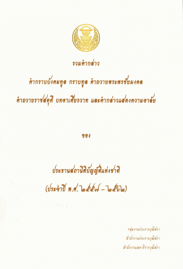 รวมคำกล่าว คำกราบบังคมทูล กราบทูล คำถวายพระพรชัยมงคล คำถวายราชสดุดี บทอาเศียรวาท และคำกล่าวแสดงความอาลัย ของ ประธานสภานิิติบัญญัติแห่งชาติ (ประจำปี พ.ศ. 2557 - 2562) / กลุ่มงานประธานวุฒิสภา สำนักงานประธานวุฒิสภา สำนักงานเลขาธิการวุฒิสภา.