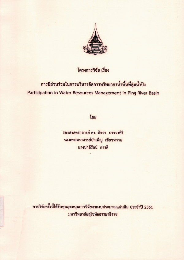 การมีส่วนร่วมในการบริหารจัดการทรัพยากรน้ำพื้นที่ลุ่มน้ำปิง = Participation in water resources management in Ping River Basin / สัจจา บรรจงศิริ, บำเพ็ญ เขียวหวาน, ปาลีรัตน์ การดี.
