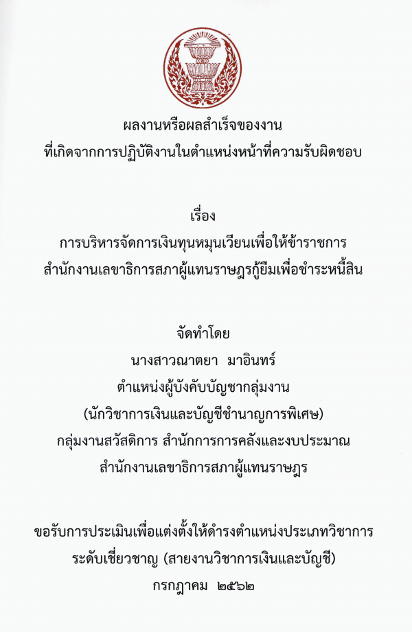 การบริหารจัดการเงินทุนหมุนเวียนเพื่อให้ข้าราชการสำนักงานเลขาธิการสภาผู้แทนราษฎรกู้ยืมเพื่อชำระหนี้สิน / ณาตยา มาอินทร์.