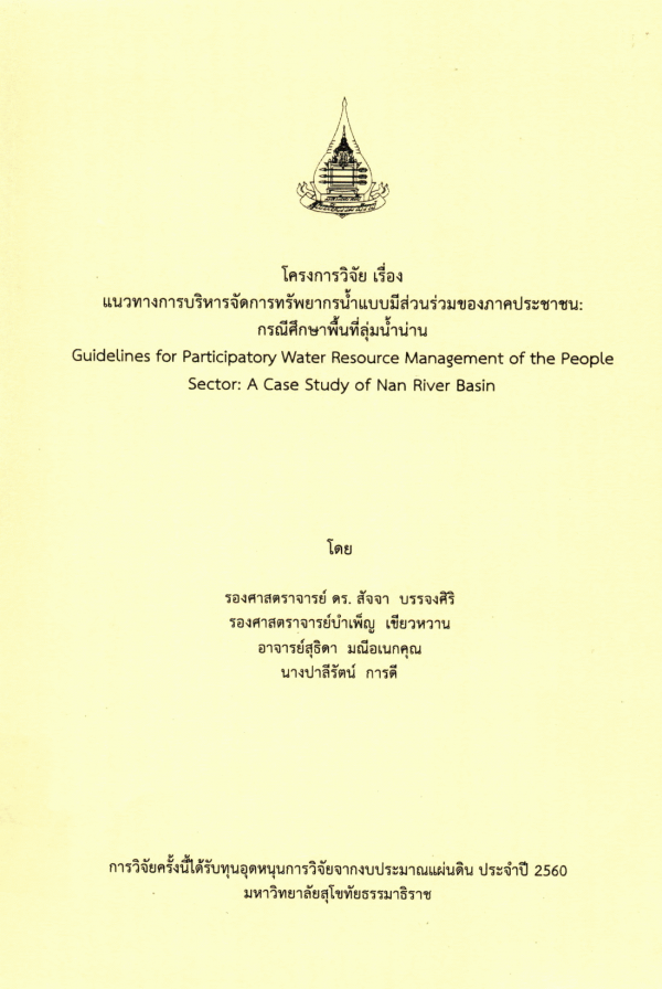 แนวทางการบริหารจัดการทรัพยากรน้ำแบบมีส่วนร่วมของภาคประชาชน : กรณีศึกษาพื้นที่ลุ่มน้ำน่าน / สัจจา บรรจงศิริ, บำเพ็ญ เขียวหวาน, สุธิดา มณีอเนกคุณ, ปาลีรัตน์ การดี.