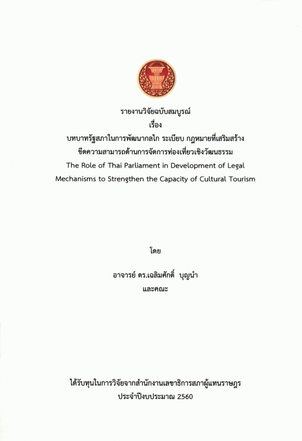 บทบาทรัฐสภาในการพัฒนากลไก ระเบียบ กฎหมายที่เสริมสร้างขีดความสามารถด้านการจัดการท่องเที่ยวเชิงวัฒนธรรม / เฉลิมศักดิ์ บุญนำ.