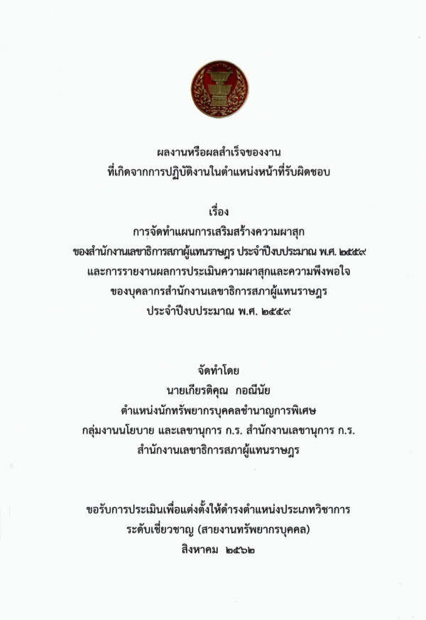 การจัดทำแผนการเสริมสร้างความผาสุกของสำนักงานเลขาธิการสภาผู้แทนราษฎร ประจำปีงบประมาณ พ.ศ. 2559 และการรายงานผลการประเมินความผาสุกและความพึงพอใจของบุคลากรสำนักงานเลขาธิการสภาผู้แทนราษฎร ประจำปีงบประมาณ พ.ศ. 2559 / เกียรติคุณ กอณีนัย.