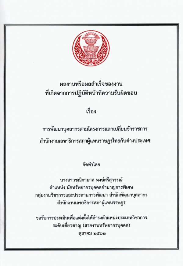 การพัฒนาบุคลากรตามโครงการแลกเปลี่ยนข้าราชการ สำนักงานเลขาธิการสภาผู้แทนราษฎรไทยกับต่างประเทศ / ชณิกามาศ หงษ์ศรีสุวรรณ์.
