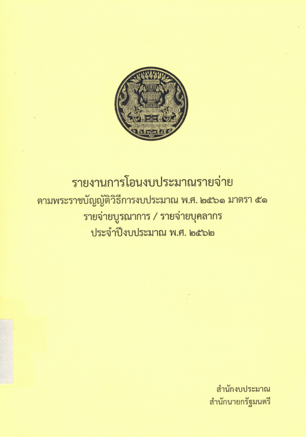รายงานการโอนงบประมาณรายจ่ายตามพระราชบัญญัติวิธีการงบประมาณ พ.ศ. 2561 มาตรา 51 รายจ่ายบูรณาการ / รายจ่ายบุคลากร ประจำปีงบประมาณ พ.ศ. 2562 / สำนักงบประมาณ สำนักนายกรัฐมนตรี.