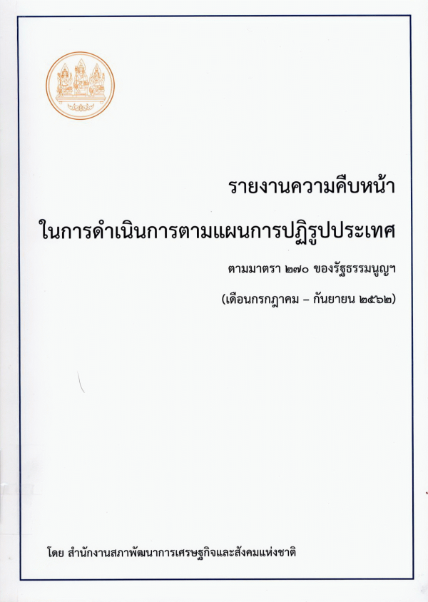 รายงานความคืบหน้าในการดำเนินการตามแผนการปฏิรูปประเทศ ตามมาตรา 270 ของรัฐธรรมนูญฯ (เดือนกรกฎาคม - กันยายน 2562) / สำนักงานสภาพัฒนาการเศรษฐกิจและสังคมแห่งชาติ.