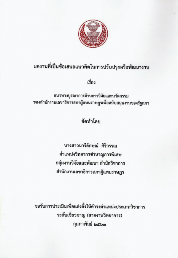 แนวทางบูรณาการด้านการวิจัยและนวัตกรรมของสำนักงานเลขาธิการสภาผู้แทนราษฎรเพื่อสนับสนุนงานของรัฐสภา / นารีลักษณ์ ศิริวรรณ.