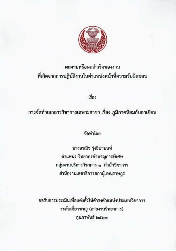 การจัดทำเอกสารวิชาการเฉพาะสาขา เรื่อง ภูมิภาคนิยมกับอาเซียน / อรณิช รุ่งธิปานนท์.
