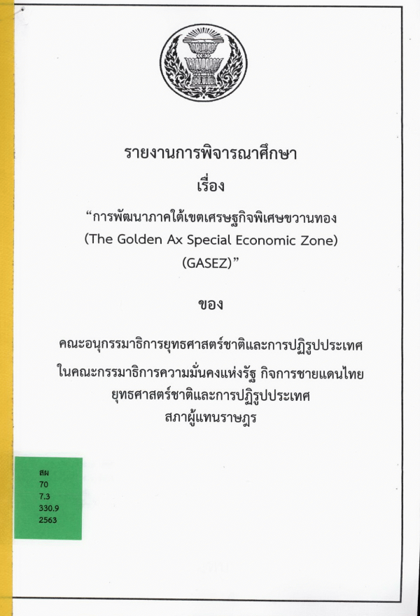 รายงานการพิจารณาศึกษา เรื่อง การพัฒนาภาคใต้เขตเศรษฐกิจพิเศษขวานทอง (The Golden Ax Special Economic Zone) (GASEZ) ของ คณะอนุกรรมาธิการยุทธศาสตร์ชาติและการปฏิรูปประเทศในคณะกรรมาธิการความมั่นคงแห่งรัฐ กิจการชายแดนไทยยุทธศาสตร์ชาติและการปฏิรูปประเทศ สภาผู้แทนราษฎร / คณะอนุกรรมาธิการยุทธศาสตร์และการปฏิรูปประเทศในคณะกรรมาธิการความมั่นคงแห่งรัฐ กิจการชายแดนไทยยุทธศาสตร์ชาติและการปฏิรูปประเทศ สภาผู้แทนราษฎร.