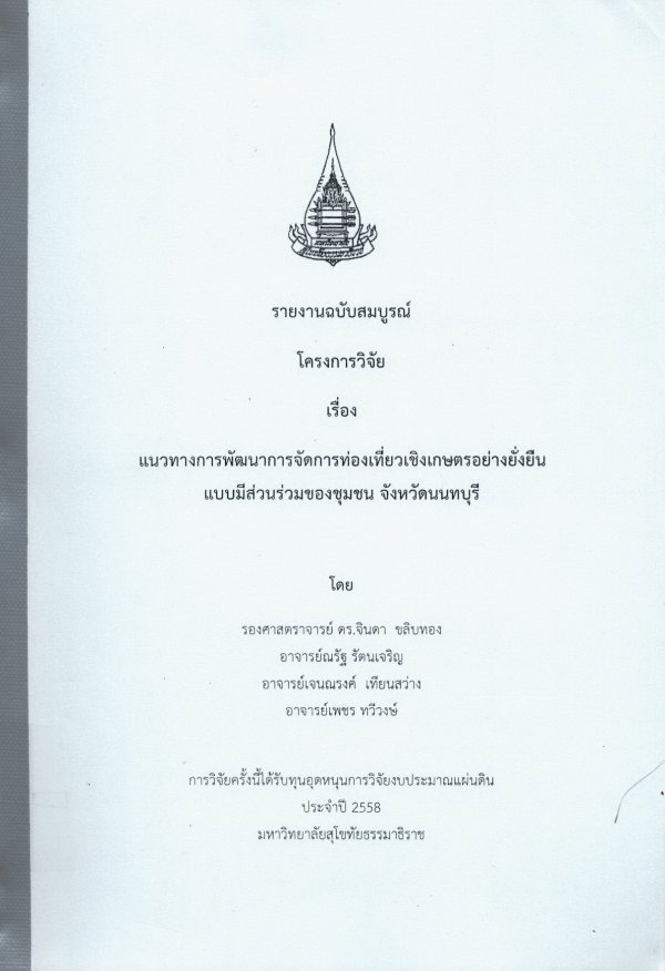 แนวทางการพัฒนาการจัดการท่องเที่ยวเชิงเกษตรอย่างยั่งยืนแบบมีส่วนร่วมของชุมชน จังหวัดนนทบุรี / จินดา ขลิบทอง, ณรัฐ รัตนเจริญ, เจนณรงค์ เทียนสว่าง, เพชร ทวีวงษ์.