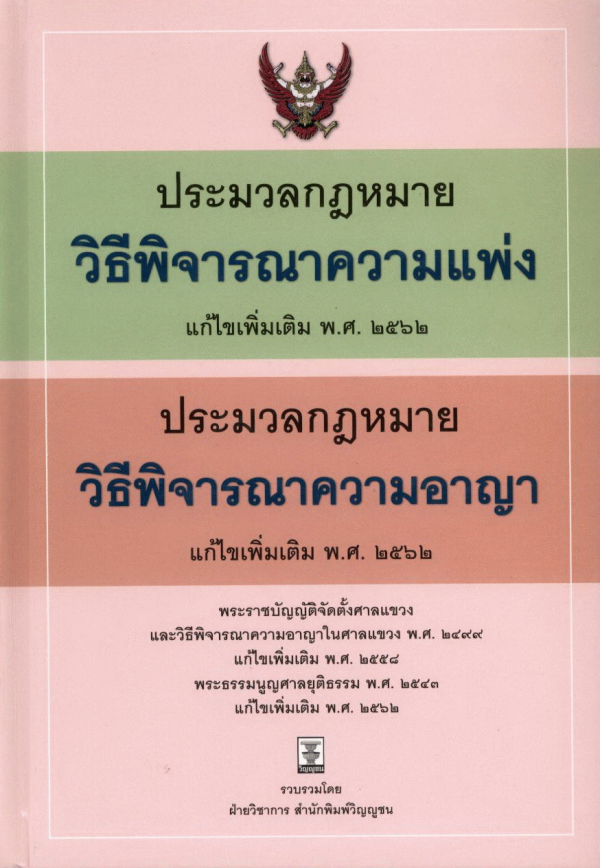 - ประมวลกฎหมายวิธีพิจารณาความแพ่ง แก้ไขเพิ่มเติม พ.ศ. 2562 ประมวลกฎหมายวิธีพิจารณาความอาญา แก้ไขเพิ่มเติม พ.ศ. 2562 พระราชบัญญัติจัดตั้งศาลแขวง แและวิธีพิจารณาความอาญาในศาลแขวง พ.ศ. 2499 แก้ไขเพิ่มเติม พ.ศ. 2558 พระธรรมนูญ พ.ศ. 2543 แก้ไขเพิ่มเติม พ.ศ. 2562 [Cover title]