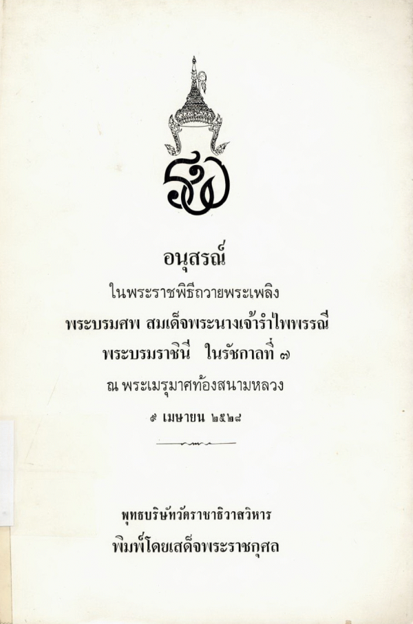 อนุสรณ์ในพระราชพิธีถวายพระเพลิงพระบรมศพ สมเด็จพระนางเจ้ารำไพพรรณี พระบรมราชินี ในรัชกาลที่ 7 ณ พระเมรุมาศท้องสนามหลวง 9 เมษายน 2528 / พุทธบริษัทวัดราชาธิวาสวิหาร พิมพ์โดยเสด็จพระราชกุศล.