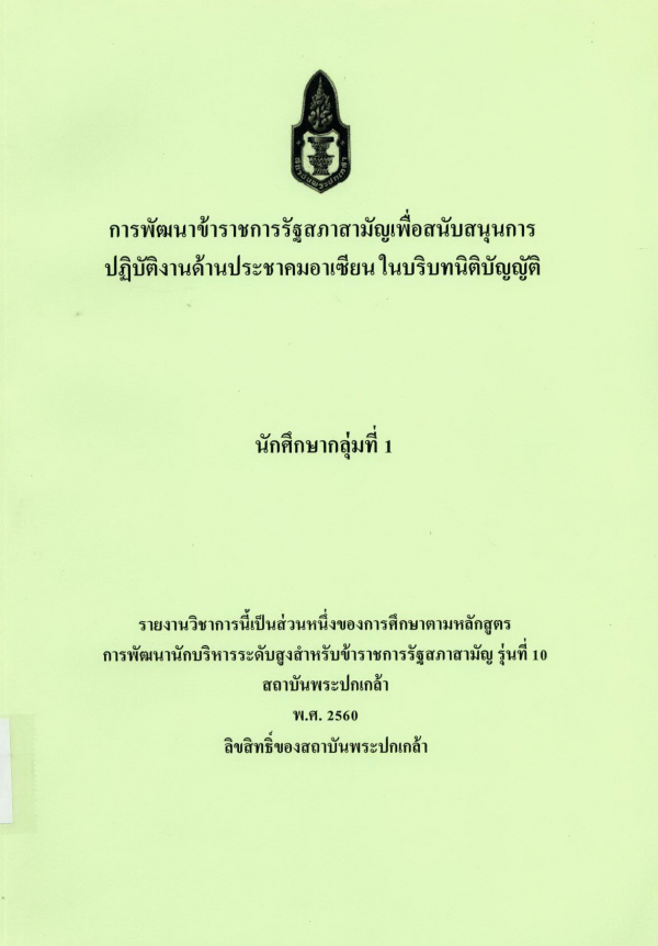 นักศึกษาสถาบันพระปกเกล้า หลักสูตรการพัฒนานักบริหารระดับสูง สำหรับข้าราชการรัฐสภาสามัญ รุ่นที่ 10 กลุ่มที่ 1, เกียรติคุณ กอณีนัย, ฉันทนา คำกัมพล, ชลัยยกร ศิวะเสน, บุศรา เพ็งนุ่ม, ภัสสุภางค์ พันธวงศ์, รุ่งรวี วรรณจีระ, วิภูสนา สาคริตชานันท์, วิโรจน์ นุ่นสุวรรณ์, อธินี พงษ์สิน and สถาบันพระปกเกล้า. การพัฒนาข้าราชการรัฐสภาสามัญเพื่อสนับสนุนการปฏิบัติงานด้านประชาคมอาเซียน ในบริบทนิติบัญญัติ. กรุงเทพฯ: สถาบันพระปกเกล้า. 2560.