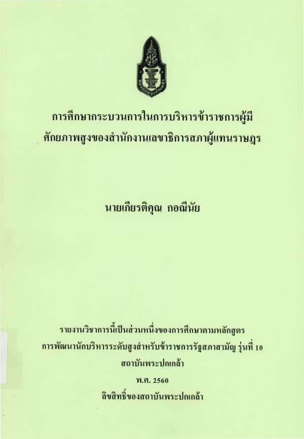 การศึกษากระบวนการในการบริหารข้าราชการผู้มีศักยภาพสูงของสำนักงานเลขาธิการสภาผู้แทนราษฎร / เกียรติคุณ กอณีนัย ; สถาบันพระปกเกล้า