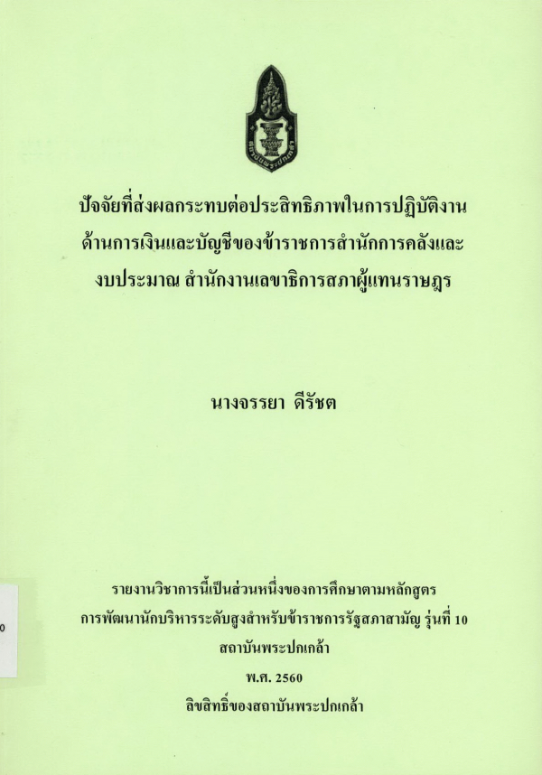 ปัจจัยที่ส่งผลกระทบต่อประสิทธิภาพในการปฏิบัติงานด้านการเงินและบัญชีของข้าราชการสำนักการคลังและงบประมาณ สำนักงานเลขาธิการสภาผู้แทนราษฎร / จรรยา ดีรัชต ; สถาบันพระปกเกล้า.