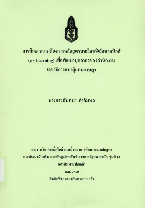 การศึกษาความต้องการหลักสูตรบทเรียนอิเล็กทรอนิกส์ (e - Learning) เพื่อพัฒนาบุคลากรของสำนักงานเลขาธิการสภาผู้แทนราษฎร / ฉันทนา คำกัมพล ; สถาบันพระปกเกล้า.
