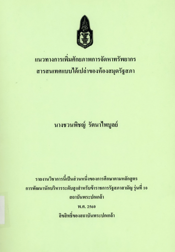 แนวทางการเพิ่มศักยภาพการจัดหาทรัพยากรสารสนเทศแบบได้เปล่าของห้องสมุดรัฐสภา / ชวนพิชญ์ รัตนาไพบูลย์ ; สถาบันพระปกเกล้า.