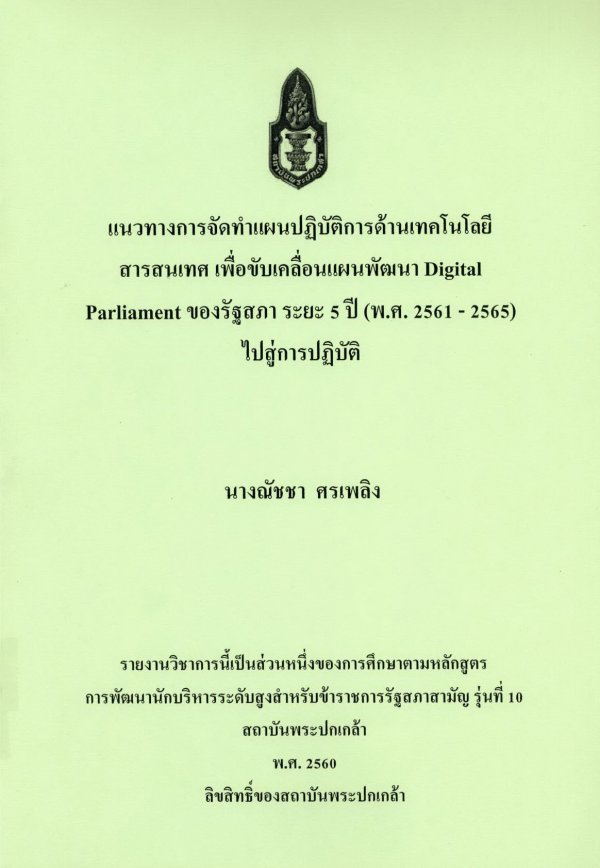 แนวทางการจัดทำแผนปฏิบัติการด้านเทคโนโลยีสารสนเทศ เพื่อขับเคลื่อนแผนพัฒนา Digital Parliament ของรัฐสภา ระยะ 5 ปี (พ.ศ. 2561 - 2565) ไปสู่การปฏิบัติ / ณัชชา ศรเพลิง ; สถาบันพระปกเกล้า.