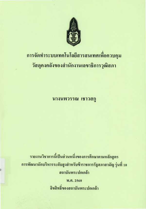 การจัดทำระบบเทคโนโลยีสารสนเทศเพื่อควบคุมวัสดุคงคลังของสำนักงานเลขาธิการวุฒิสภา / นพวรรณ เชาวสกู ; สถาบันพระปกเกล้า.