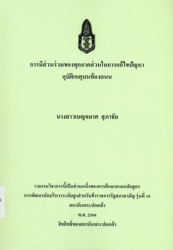 การมีส่วนร่วมของทุกภาคส่วนในการแก้ไขปัญหาอุบัติเหตุบนท้องถนน / เบญจมาศ สุภาชัย ; สถาบันพระปกเกล้า.
