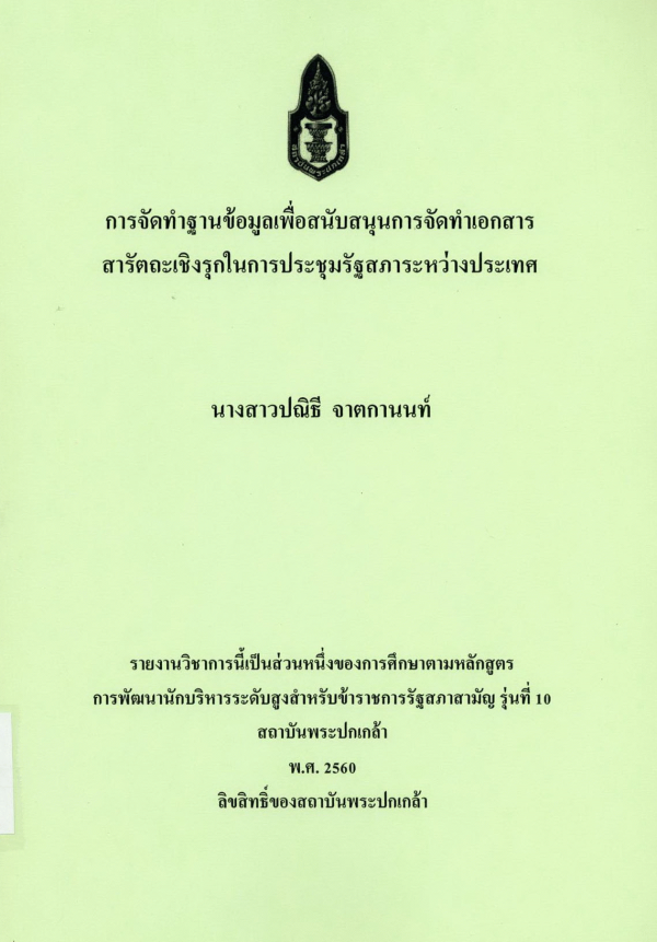 การจัดทำฐานข้อมูลเพื่อสนับสนุนการจัดทำเอกสารสารัตถะเชิงรุกในการประชุมรัฐสภาระหว่างประเทศ / ปณิธี จาตกานนท์ ; สถาบันพระปกเกล้า.