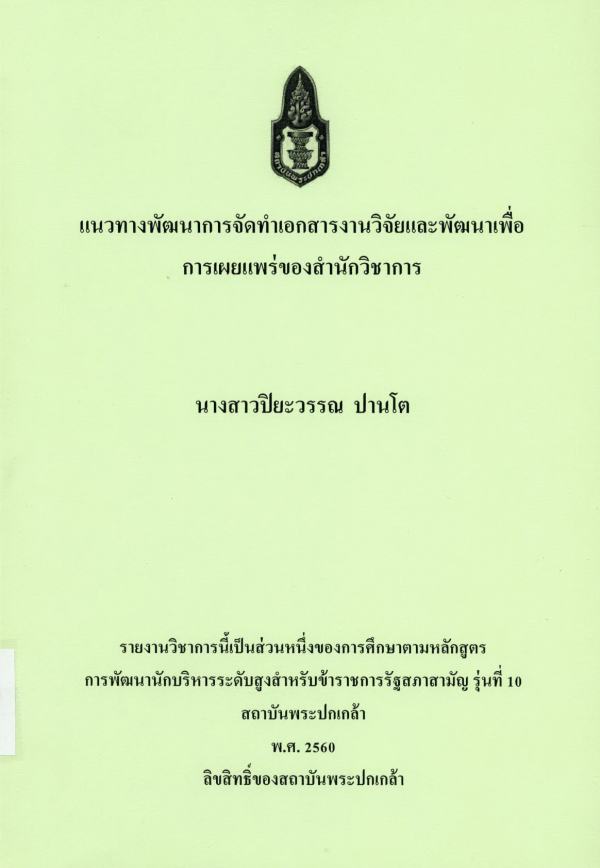 แนวทางพัฒนาการจัดทำเอกสารงานวิจัยและพัฒนาเพื่อการเผยแพร่ของสำนักวิชาการ / ปิยะวรรณ ปานโต ; สถาบันพระปกเกล้า.