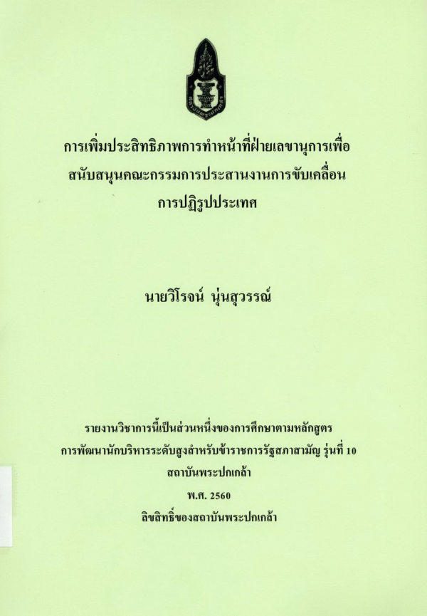 การเพิ่มประสิทธิภาพการทำหน้าที่ฝ่ายเลขานุการเพื่อสนับสนุนคณะกรรมการประสานงานการขับเคลื่อนการปฏิรูปประเทศ / วิโรจน์ นุ่นสุวรรณ์ ; สถาบันพระปกเกล้า.