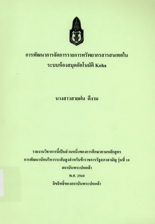 การพัฒนาการจัดรายการทรัพยากรสารสนเทศในระบบห้องสมุดอัตโนมัติ Koha / สายฝน ดีงาม ; สถาบันพระปกเกล้า.