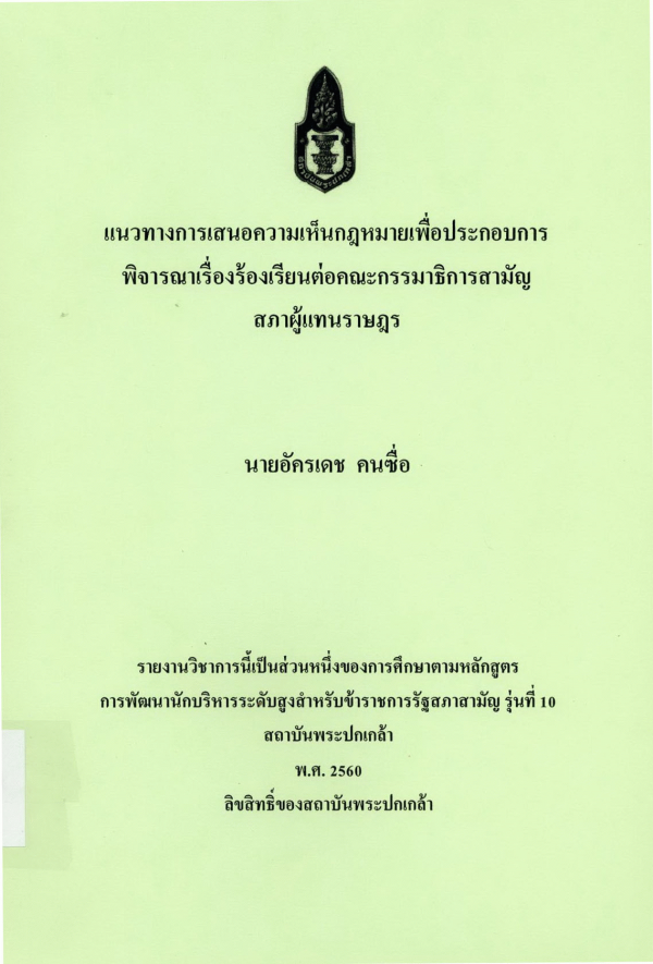 แนวทางการเสนอความเห็นกฎหมายเพื่อประกอบการพิจารณาเรื่องร้องเรียนต่อคณะกรรมาธิการสามัญ สภาผู้แทนราษฎร / อัครเดช คนซื่อ ; สถาบันพระปกเกล้า.