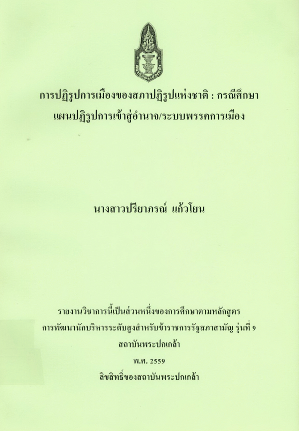 การปฏิรูปการเมืองของสภาปฏิรูปแห่งชาติ : กรณีศึกษาแผนปฏิรูปการเข้าสู่อำนาจ/ระบบพรรคการเมือง / ปรียาภรณ์ แก้วโยน ; สถาบันพระปกเกล้า.
