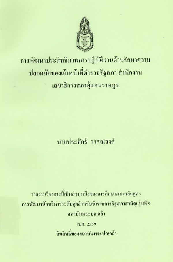 การพัฒนาประสิทธิภาพการปฏิบัติงานด้านรักษาความปลอดภัยของเจ้าหน้าที่ตำรวจรัฐสภา สำนักงานเลขาธิการผู้แทนราษฎร / ประจักร์ วรรณวงศ์ ; สถาบันพระปกเกล้า.