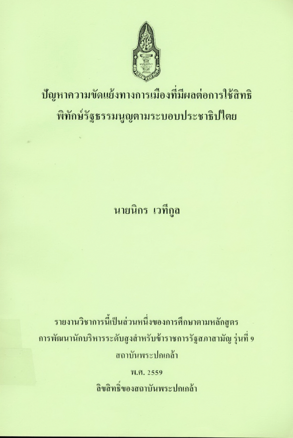 ปัญหาความขัดแย้งทางการเมืองที่มีผลต่อการใช้สิทธิพิทักษ์รัฐธรรมนูญตามระบอบประชาธิปไตย / นิกร เวทีกูล ; สถาบันพระปกเกล้า.