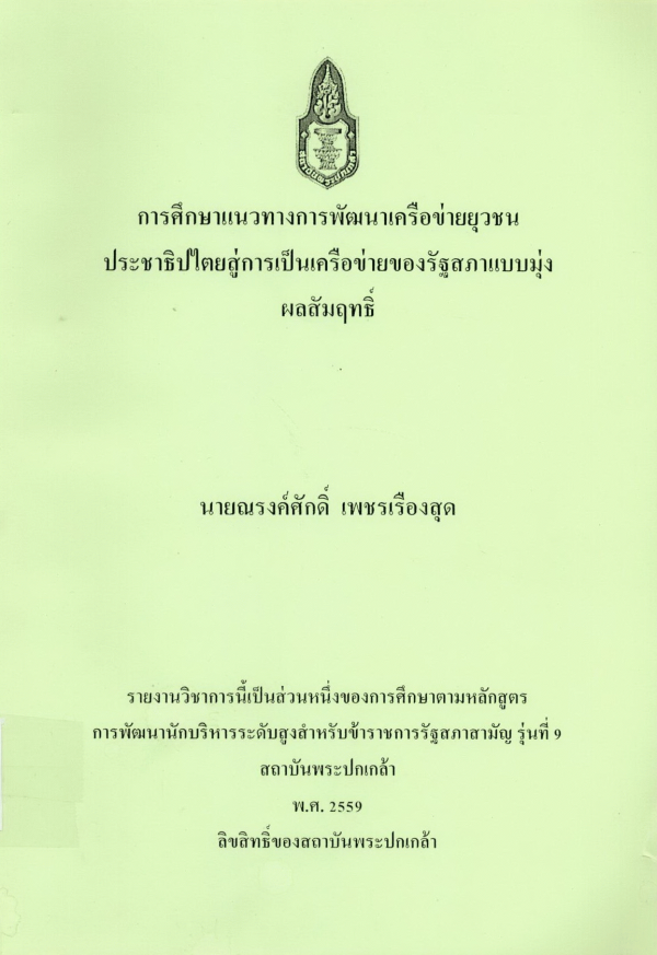 การศึกษาแนวทางการพัฒนาเครือข่ายยุวชนประชาธิปไตยสู่การเป็นเครือข่ายของรัฐสภาแบบมุ่งผลสัมฤทธิ์ / ณรงค์ศักดิ์ เพชรเรืองสุด ; สถาบันพระปกเกล้า.