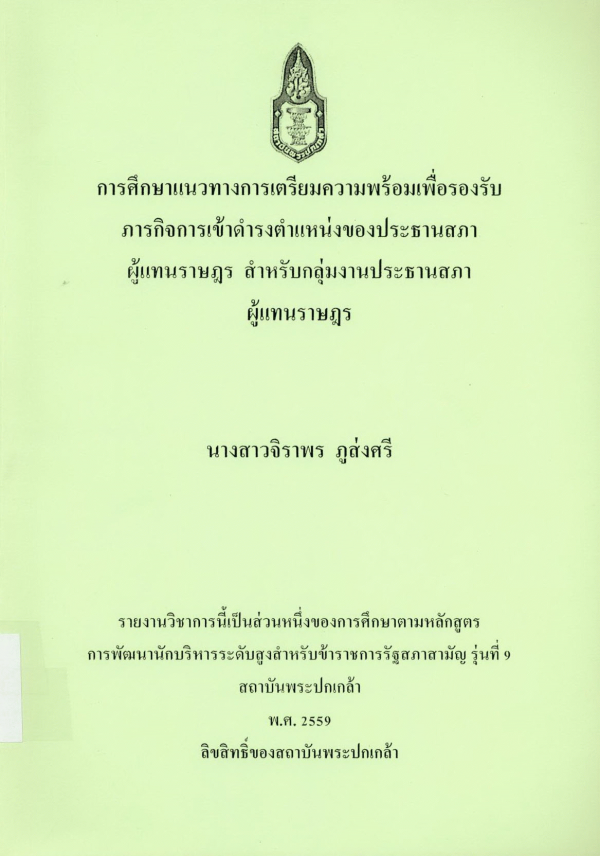 การศึกษาแนวทางการเตรียมความพร้อมเพื่อรองรับภารกิจการเข้าดำรงตำแหน่งของประธานสภาผู้แทนราษฎร สำหรับกลุ่มงานประธานสภาผู้แทนราษฎร / จิราพร ภูส่งศรี ; สถาบันพระปกเกล้า.