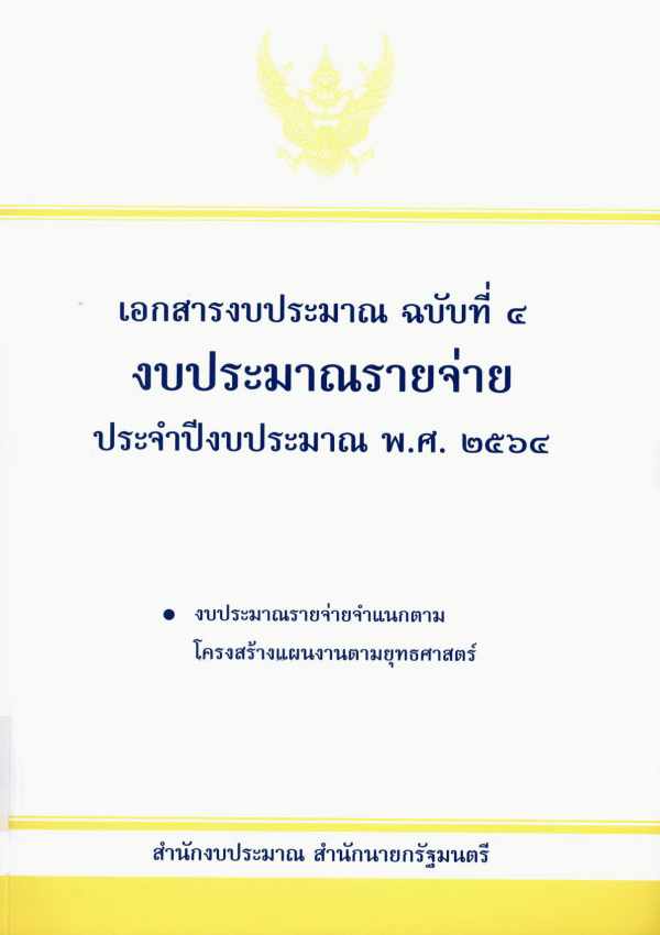 เอกสารงบประมาณ ฉบับที่ 4 งบประมาณรายจ่าย ประจำปีงบประมาณ พ.ศ. 2564 งบประมาณรายจ่ายจำแนกตามโครงสร้างแผนงานตามยุทธศาสตร์ / สำนักงบประมาณ.