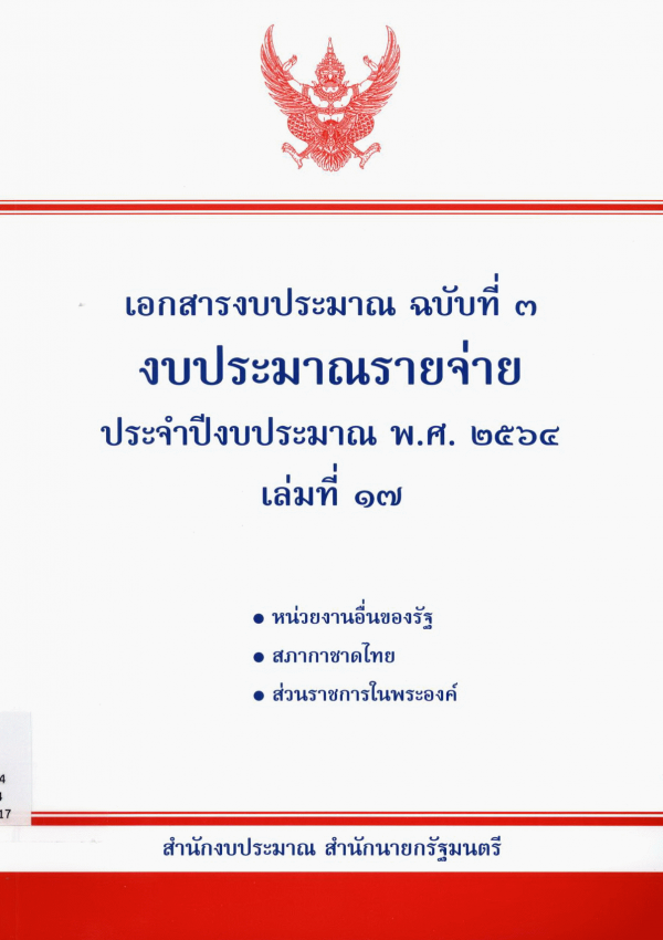 เอกสารงบประมาณ ฉบับที่ 3 งบประมาณรายจ่าย ประจำปีงบประมาณ พ.ศ. 2564 เล่มที่ 17 หน่วยงานอื่นของรัฐ สภากาชาดไทย ส่วนราชการในพระองค์ / สำนักงบประมาณ.