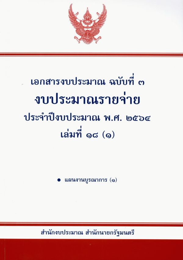 เอกสารงบประมาณ ฉบับที่ 3 งบประมาณรายจ่าย ประจำปีงบประมาณ พ.ศ. 2564 เล่มที่ 18 (1) แผนงานบูรณาการ (1) / สำนักงบประมาณ.