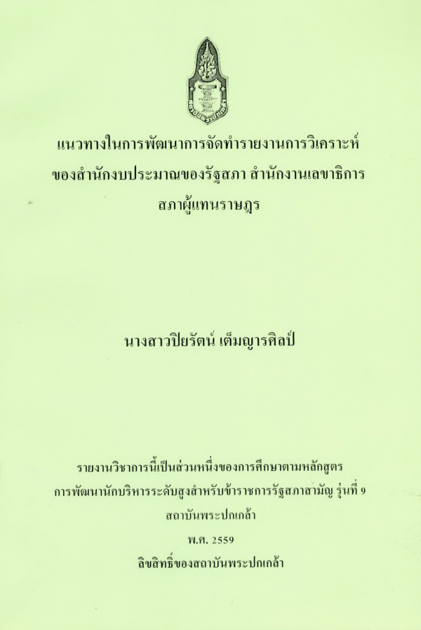 แนวทางในการพัฒนาการจัดทำรายงานการวิเคราะห์ของสำนักงบประมาณของรัฐสภา สำนักงานเลขาธิการสภาผู้แทนราษฎร / ปิยรัตน์ เต็มญารศิลป์ ; สถาบันพระปกเกล้า.