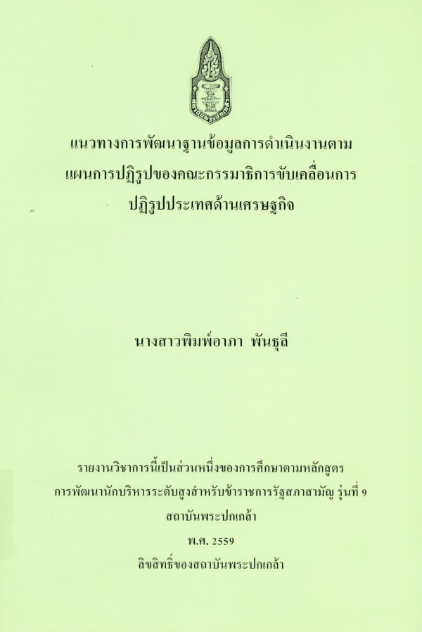 แนวทางการพัฒนาฐานข้อมูลการดำเนินงานตามแผนการปฏิรูปของคณะกรรมาธิการขับเคลื่อนการปฏิรูปประเทศด้านเศรษฐกิจ / พิมพ์อาภา พันธุลี ; สถาบันพระปกเกล้า.