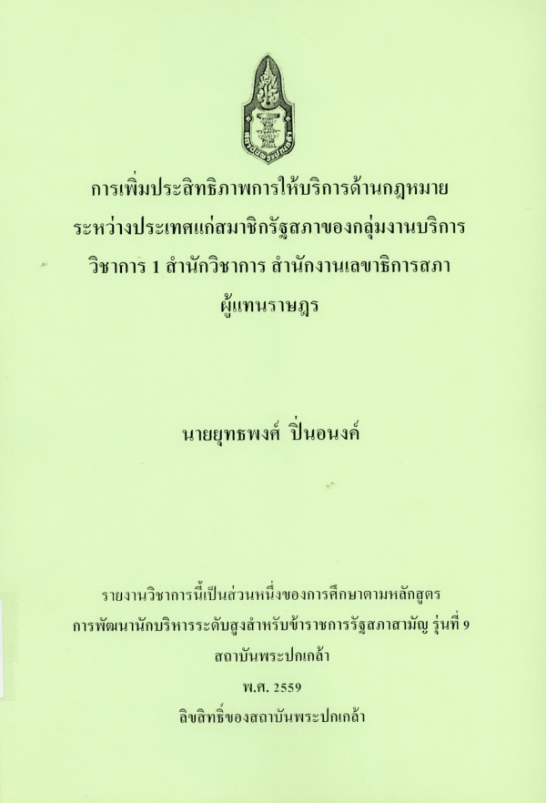 การเพิ่มประสิทธิภาพการให้บริการด้านกฎหมายระหว่างประเทศแก่สมาชิกรัฐสภาของกลุ่มงานบริการวิชาการ 1 สำนักวิชาการ สำนักงานเลขาธิการสภาผู้แทนราษฎร / ยุทธพงศ์ ปิ่นอนงค์ ; สถาบันพระปกเกล้า.