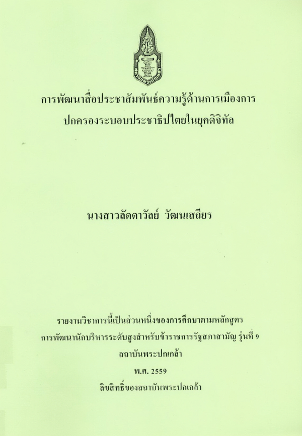 การพัฒนาสื่อประชาสัมพันธ์ความรู้ด้านการเมืองการปกครองระบอบประชาธิปไตยในยุคดิจิทัล / ลัดดาวัลย์ วัฒนเสถียร ; สถาบันพระปกเกล้า.