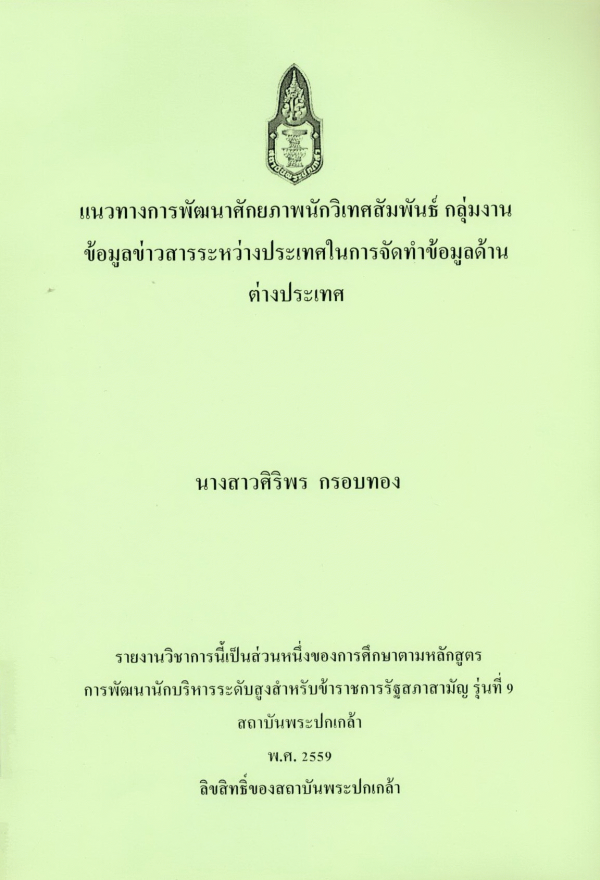 แนวทางการพัฒนาศักยภาพนักวิเทศสัมพันธ์ กลุ่มงานข้อมูลข่าวสารระหว่างประเทศในการจัดทำข้อมูลด้านต่างประเทศ / ศิริพร กรอบทอง ; สถาบันพระปกเกล้า.