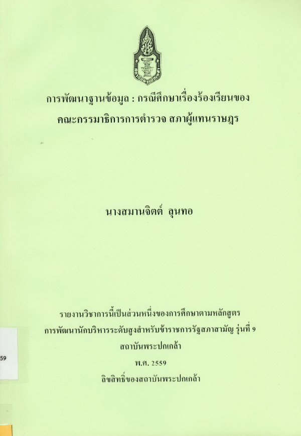 การพัฒนาฐานข้อมูล : กรณีศึกษาเรื่องร้องเรียนของคณะกรรมาธิการการตำรวจ สภาผู้แทนราษฎร / สมานจิตต์ ลุนทอ ; สถาบันพระปกเกล้า.