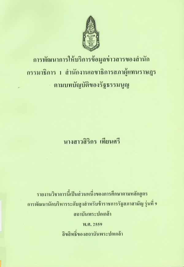 การพัฒนาการให้บริการข้อมูลข่าวสารของสำนักกรรมาธิการ 1 สำนักงานเลขาธิการสภาผู้แทนราษฎร ตามบทบัญญัติของรัฐธรรมนูญ / สิริกร เทียนศรี ; สถาบันพระปกเกล้า.
